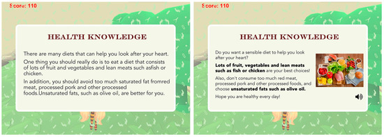The presentation of this health knowledge needs to be tailored to the target audience of older adults. When designing applications specifically for older adults, it is important to use clear, objective, and educational language. Using a condescending tone or complex language will only hinder the efficiency of game interaction and increase older adults’ fear of digital technology. Therefore, when presenting health knowledge to older adults, it is important not to excessively emphasize the authority of the knowledge but to consider ways to make it easier and quicker for them to comprehend the information. For example, if the health knowledge aims to convey information related to diet, as shown in Figure 6, the image on the left may appear too authoritative and monotonous. The image on the right uses a friendly tone and presents the health knowledge through visuals and audio.