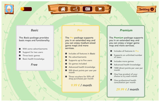 Fit Islands has added a product point exchange and membership system, where points can be earned through farm cultivation, sports games, cognitive games, and interaction with friends. These points can be exchanged in the shop for virtual game character skins as well as some real elderly goods, such as electronic blood pressure monitors, etc. As a free digital product targeting older adults, appropriate adverts or videos are played at the end of the game. This will attract brands, communities, nursing homes, etc. with the same target audience to place commercial ads or offer real products. Using this advertising revenue wisely, the system could be further improved and upgraded to attract more older adults to play Fit Islands. Fit Islands will also strictly control the quality of these commercial products and the correct orientation of the advertising content. The products will be delivered to the seniors by post, and Fit Islands will have an agreement with the brand to keep the address of the user private to ensure the security of the seniors’ information. To adapt to different scenarios in smart cities, Fit Islands offers three levels of membership for different tiers of players (see Figure 7).