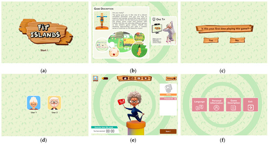 The design of UI for older adults needs to take into account their habits and preferences in terms of style and aesthetics, to compensate for actual physical and cognitive changes. Fit Islands has been designed to meet the design principles of Section 2. For example, ensuring that the UI has both large and easily viewable key elements, using bold and age-friendly colors [103], having an adaptable interface and settings, incorporating dynamic resources such as images and voice and multimodal feedback, and using blank areas to emphasize key points (see Figure 8). After entering the game map, the game not only gives players full freedom, but also creates a natural scene through ambient sounds and dynamic effects, so players will have an immersive experience of running freely and exploring everywhere on the island.