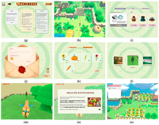The main interface in the demonstration. (a) Initial interface; (b) game description; (c) user registration; (d) interface for selecting gender; (e) main interface; (f) settings interface; (g) membership interface; (h) game map; (i) shop interface; (j) post office interface; (k) farm interface; (l) game center; (m) Exergame interface; (n) health knowledge interface; (o) multiplayer interface.