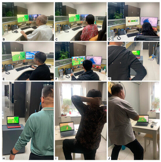 The initial testing of the demonstration for Fit Islands was split into two phases. In the first phase, a 62-year-old German woman (test subject A) was invited to test the functionality and operation of the game after the initial demonstration was completed. After receiving feedback, the initial game demonstration was refined. The second stage was to invite nine Chinese older adults (test subjects B–J) to test the functionality and usability of the game after the completion of the refined game demonstration. The nine seniors, aged 51–77, included three women and six men. These older adults were asked to operate and use the game and to provide feedback on the corresponding issues (see Figure 9).