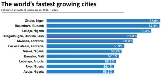 To respond to the challenges posed by these exponential population growths, African cities have already created technopoles and are currently implementing initiatives borrowing from the smart cities concept. In terms of growth, the top ten fastest growing cities in the world—as well as their projected growth by 2025—are all African (Figure 2), a sign of how swiftly the continent’s population is expanding. As urbanization is a recent and very rapid phenomenon in Africa, cities are not yet equipped with complex and high-tech systems, as some cities in Europe, America, and Asia can be. Despite their difficulties linked to a very strong demographic explosion, significant inequalities, healthcare, and education systems that are still underperforming, and sometimes unstable political contexts, African cities are gradually beginning to take innovative initiatives.