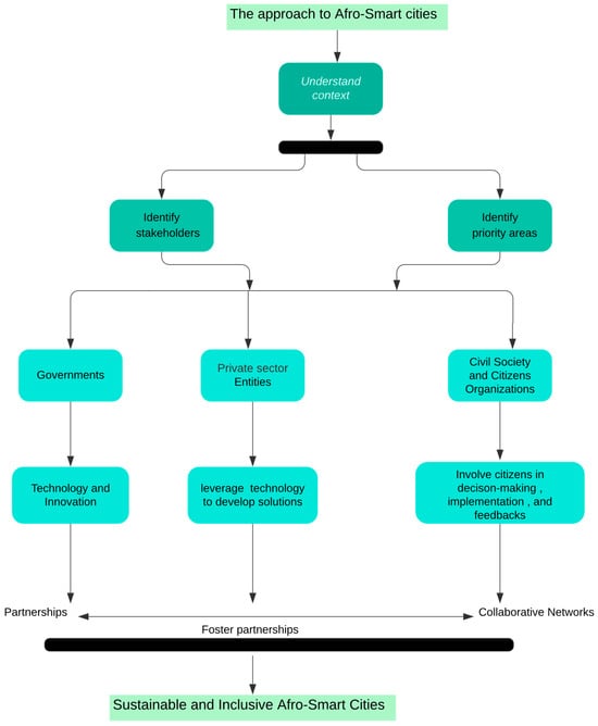 This schema (Figure 4) illustrates the interconnected steps involved in approaching Afro-Smart Cities. Understanding the local context leads to the identification of key stakeholders and priority areas [105]. Leveraging technology and innovation, along with involving citizens, contributes to the development and implementation of sustainable and inclusive Afro-Smart Cities. The final step emphasizes the importance of fostering partnerships and collaborative networks to achieve the desired outcomes.