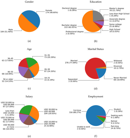 The sociodemographic profile of our sample presents a diverse yet predominantly middle-aged, middle-income, and well-educated demographic, with a significant majority being married and employed full-time. The gender distribution was nearly balanced, with females constituting 48.60% (n = 174) and males representing 51.40% (n = 184) of the participants. In terms of age, most of the sample was between 26 and 55 years old, accounting for 80.28% of the participants, indicating a predominantly adult demographic. Specifically, individuals aged 26–30 formed the largest age group at 24.30% (n = 87), followed by those aged 31–35 at 20.39% (n = 73). The salary ranges showed a concentration in the middle-income brackets, with 29.05% (n = 104) of the participants earning between USD 30,000 and USD 49,999, and 27.09% (n = 97) earning between USD 50,000 and USD 69,999. A significant portion, 18.44% (n = 66), reported earning USD 90,000 or more. Educational attainment varied, but a substantial majority of the sample held a bachelor’s degree (62.01%; n = 222), and 21.79% (n = 78) had completed a master’s degree. Only a small fraction had professional degrees (0.56%, n = 2) or doctoral degrees (0.28%, n = 1). Marital status was predominantly married at 77.09% (n = 276), with single (never married) participants making up 18.99% (n = 68). Separated, divorced, and widowed statuses were minimal, each constituting less than 3% of the sample. Employment data indicated that a vast majority were in full-time employment (88.27%, n = 316), with part-time employment making up 6.70% (n = 24). Those retired accounted for 2.51% (n = 9), while 1.68% (n = 6) were seeking work, and a single student represented a mere 0.28% (n = 1) of the sample. The sociodemographic variables of the sample are presented in greater detail in Figure 1.