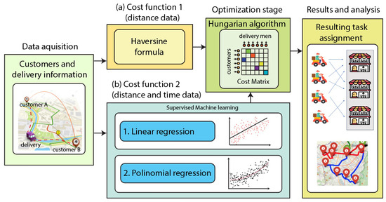 - The complexity of managing several orders for the automatic assignment of the delivery personnel is one of the inherent inefficiencies of the delivery process. To address this difficulty, it is necessary to consider different scenarios. For example, it should be considered in some way that different orders can be assigned to different distributors, and that the possibility of making an optimal delivery for a customer does not necessarily mean that the entire set of deliveries can be done optimally. Fortunately, optimal assignment algorithms such as the proposed Hungarian algorithm combined with machine learning methods can reduce cost functions to solve optimization problems optimally.
