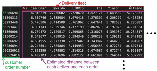 The calculated distances are then used to obtain the matrix that represents the cost function used to solve the task assignment problem, which is composed of the distance between each delivery man and each customer order, as illustrated in Figure 2. The matrix used during the experiments is composed of 7707 possible deliveries and 7707 customer orders.