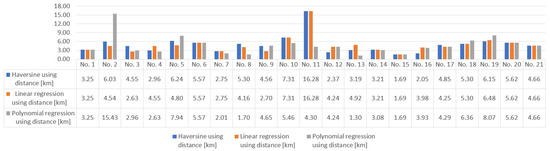 The results presented in Table 2 show the performance of the proposed methods in estimating distances traveled by the delivery people after solving the task assignment problem with the Hungarian algorithm. The Hungarian method yields an average distance estimation of 4.55 km with a standard deviation of ±3.24 km, resulting in a total summation of 34,956.84 km. Interestingly, when combining linear regression with the Hungarian method, the average estimation remains consistent at 4.55 km, with a slightly reduced standard deviation of ±3.23 km, contributing to a marginally increased total summation of 34,957.74 km. Conversely, employing polynomial regression in conjunction with the Hungarian method leads to a slightly higher average distance estimation of 4.62 km accompanied by a larger standard deviation of ±4.49 km, resulting in a total summation of 35,526.26 km. These findings suggest that while both linear and polynomial regression exhibit similar average distance estimations when combined with the Hungarian method, polynomial regression introduces greater variability in distance estimations, as indicated by its higher standard deviation. Notably, considering that less distance is better, the Hungarian method and the linear regression combined with the Hungarian method emerge as the most effective approaches when distance estimation is used to solve the assignment problem for the proposed dataset.