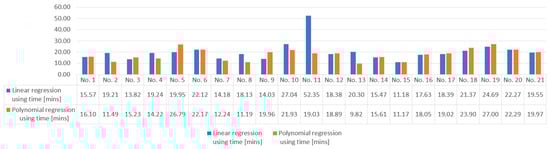 As can be observed in Table 3, for the linear regression method the average time estimation is 19.24 min, accompanied by a standard deviation of ±9.12 min, resulting in a total summation of 147,891.23 min. Conversely, the polynomial regression method yields a notably lower average time estimation of 17.01 min along with a reduced standard deviation of ±5.25 min, contributing to a shorter total summation of 130,747.82 min. These results indicate that polynomial regression offers more precise estimations with less variability compared to linear regression when solving the task assignment problem with the Hungarian method.
