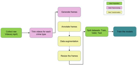 Figure 3 depicts our project’s complete data process lifetime, beginning with the collection of the raw video information and ending with the final product. Data preprocessing, data transformation, and data preparation are the major components. As part of the data preprocessing phase, we manually clipped films for each crime category and then used those segments to build frames. Since most crime videos we received were only a few minutes long, and the crime itself only occurred during a brief window of time, we needed to trim the videos down to just the relevant parts in order to maximize the effectiveness of our training, which also entailed creating frames for every trimmed video. Frame resizing, data augmentation for greater lighting and perspective of frames, and annotating frames are all examples of data transformation that are used as input to a model. Separating raw data into three distinct sets—a training dataset, a validation dataset, and a testing dataset—was the next step in the data preparation process. Three Google drive folders were created: one for the training data, one for the validation data, and one for the testing data. A total of 80% of the training data was utilized to train our deep learning models, with 15% for validation, and 5% for testing.