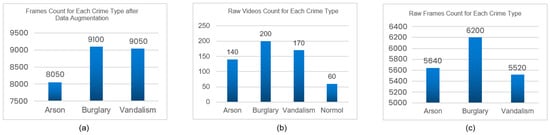 (a) Frame count after data augmentation, (b) total raw datasets video count for crime types and normal events, and (c) raw frame count for each crime type.