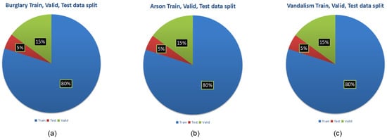 (a) Burglary train, valid, test data split, (b) arson train, valid, test data split, and (c) vandalism train, valid, test data split.