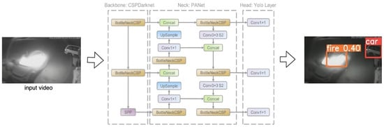 Improved YOLOv5: YOLO, also known as you only look once, is an algorithm of object detection [13]; it redefines object detection as a regression problem, applies a single convolutional neural network (CNN) to the entire image, divides the image into grids, and predicts class probabilities and bounding boxes for each grid. The YOLOv5 model is improved based on the YOLOv3 model [14]. There are four models: YOLOv5s, YOLOv5m, YOLOv5l, and YOLOv5x. The YOLOv5 model consists of backbone network, neck, and head. The backbone network is composed of Focus, BottleneckCSP, and SSP networks including modules such as Focus, Conv convolution block, BottleneckCSP, and SSP, with an input image sized 640 × 640 × 3; we sliced through the Focus module to reduce the height and width of the image, output the image size to 320 × 320, and convert the height and width of the sliced image through Concat Integrate, increasing the number of channels of the input image to 64, then performing feature extraction on the integrated image to get a featured mAP (mean average precision), the SSP uses max pooling and aggregates feature mAPs through Concat. For the neck part, a bottleneck was used in order to improve network speed while ensuring accuracy. The head of YOLOv5 uses multi-scale feature mAPs for detection; large images are used to detect small targets, and small images are used to detect large targets, and finally, we obtained three scales of feature mAPs.There were only two types of crime detection for arson which were arson and normal, and prediction based on our self-made dataset, then we output the target as well as bounding box. To better extract the features from the input, the model was pre-trained by the COCO dataset, as our customized dataset applied transfer learning to predict and classify arson crime, replacing the default eighty classes to six classes. The backbone was the layers to extract input image features, and we froze the first ten layers of the backbone so the weights would not change during transfer learning, and change to smaller batch sizes in order to decrease the computation cost with faster training.The arson behavior has been identified using the Improved YOLOv5 Architecture, as depicted in Figure 7.