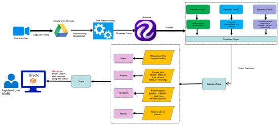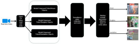 After we trained, fine-tuned, and saved the individual model to the best.pt file, we used OpenCV packages to further deploy our crime system. We integrated our model in a hybrid way with burglary crime detection, arson crime detection, vandalism crime detection, and normal detection; detection was deployed in parallel and the integrated model was combined with the crime detection recognition system. The combined model was fed with different image sizes as input, 224 × 224 for the Improved YOLOv5 model for arson detection, 640 × 640 for the Improved YOLOv7 model for burglary detection [39], and 640 × 640 for the Improved YOLOv6 model for vandalism detection. The integrated model will generate a combined output displayed with crime type results (arson, burglary, vandalism, and normal), the result will be based on time, whether the video contains the potential criminal, along with their crime behaviors for certain seconds.