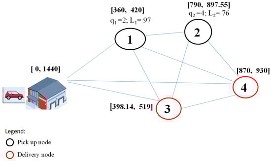 In Table 2, we present the parameters associated with the vehicle’s tour example before the computation of new customized time windows. The first request () assigned to the vehicle involves a pickup node () and a delivery node (). Similarly, the second request comprises a pickup node () and a delivery node (). For each visited node (), the table displays load (), transit time (), arrival time (), beginning of service (), and departure time ().