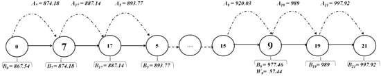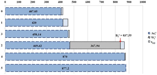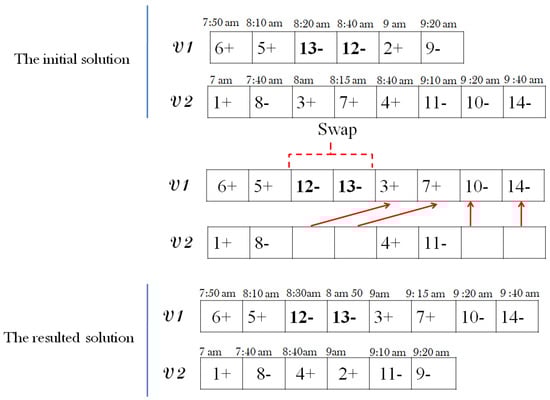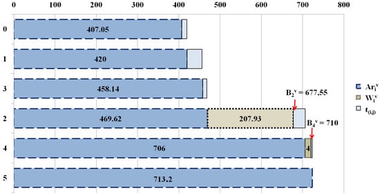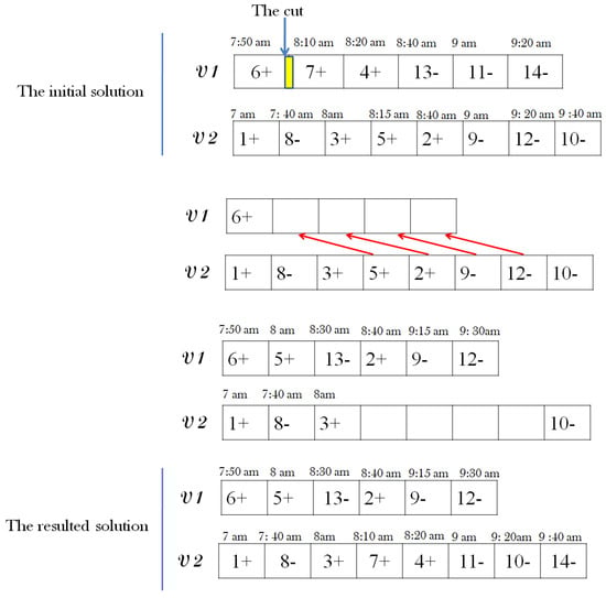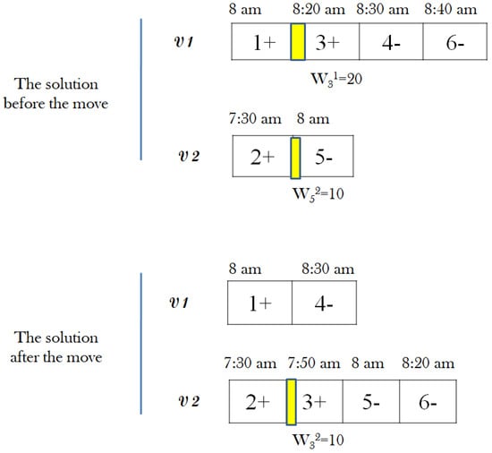 In Table 3, the new beginning of service [] is selected as the earliest service time at the delivery node (). Consequently, the beginning of service is calculated as (), given that (). Thus, is the new beginning of service at the pickup node (). This earlier beginning of service contributes to the reduction in the waiting time. The new value of is then (). The arrival time, , is also impacted. As (), where 28.45 is the transit time and 207.93 is the reduced waiting time (), then (). This new arrival time will produce a low waiting time (). However, the new total waiting time is equal to (), which is much lower than the initial one equal to ().