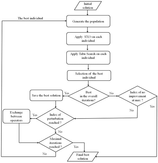 The evolutionary tabu search starts by generating an initial solution by the use of an insertion heuristic (see Section 4.2). In order to create individuals composing the first population, a mutation phase is performed where the initial solution is perturbed, producing a set of individuals. Next, each mutated solution in the population is modified by the use of a crossover named self crossover (SXO), provided in Section 4.5. In order to seek improvement in the neighborhoods of each solution, the TS method (see Section 4.6) is applied to each individual. To deal with some constraint violations, a repair procedure (see Section 4.3) is operated on each individual in the TS. Then, the obtained solutions are assessed and the best individual is selected and used for the next iteration in the ETS. This individual is also compared with the potential final solution in the search space. If it improves, it is saved as a potential new solution. In Figure 4, a chart presents the successive steps of the ETS algorithm.