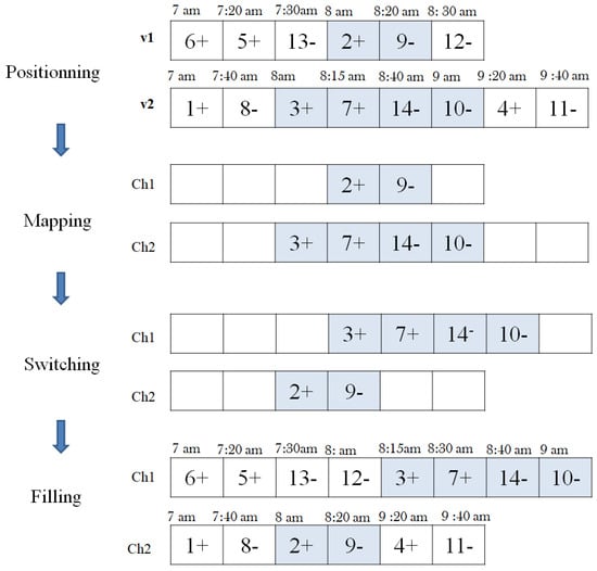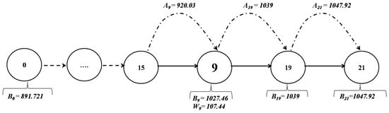 Riding times for the two requests are calculated as () and () using (6). The waiting time only applies to node (), with (), determined as () using (8). This waiting time, , affects the arrival time at the subsequent node (), as shown in Figure 2.