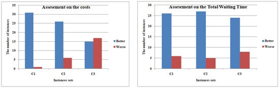 Authors in [] highlighted the impact of variations in the level of quality of service provided to customers in the operational costs of a DARP. They studied the evolution of the operational costs through the investigation of the permutations of two sets of parameters describing the service level. The maximum deviation from the user preference time and the relative maximum exceedance of the user’s direct journey time is measured according to the variation of certain parameters, such as the size of the transmission network and the diversity of customers. Moreover, the authors validated the potential trade-off between the costs and the quality of service according to variations in the service level parameters being frequently used, such as the size of the time windows and the maximal riding time. These two parameters are also emphasized in the works of [,], which reviewed and defined several measures related to the quality of service. These studies highlighted the maximal riding time and the time windows as the main criteria linked with the level of service that influence the total operational costs, and pointed out the advantage of combining them into the same model.