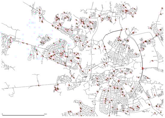 The models were implemented for a Danish district heating system on Funen, Denmark. Its grid consists of more than 1450 km of pipes, not accounting for service pipes; a screenshot of the Geographic Information System (GIS) showing transmission and distribution pipes, along with the location of likely historical failures, can be seen in Figure 1. The GIS contains more than 150,000 pipes currently active and decommissioned, including service pipes. A pipe segment in the GIS can represent multiple pipe segments in the real system, with joints saved in a different layer to be drawn on top.