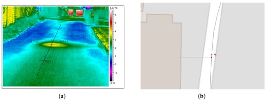 Example of the link between a thermography report and the GIS. (a) Thermal image from a thermography report showing a ground–surface hot spot, which is indicative of a leakage. (b) GIS at the location of the thermography report. The red star denotes the location of the thermal image, while the brown dots represent joints.