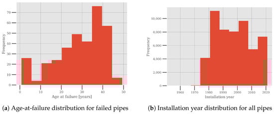 Age-at-failure distribution for failed pipes and installation year distribution for all pipes within the dataset.
