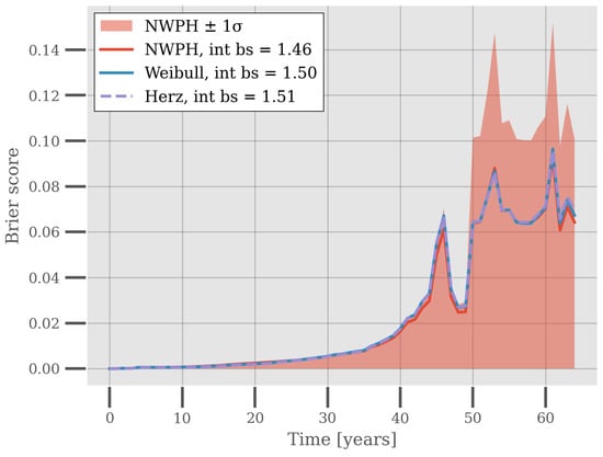 The Brier Scores for the models are shown in Figure 4. Evidently, the Brier Scores are very similar across the models, slight favoring the NWPH. However, the Brier Scores have a high standard deviation across the cross-validation experiment for all of the models. The figure shows this for the NWPH model as an example. This means that on a population basis and within the time domain currently covered by the data, the models performed equally well. It may be a testimony to the flexibility of the reliability models that they fit the data equally well, but also it may be a consequence of the relatively young population of the piping system that it is hard to discern the distributional properties of the population.