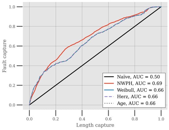 Another important characteristic of these reliability models is their ability to differentiate between the reliability or hazard rates of assets, which is important for asset maintenance decision-making and renovation planning. For this reason, the models are compared based on their fault capture length capture [35,38] (FCLC), which is a measure of the relation between the normalized cumulative sum of actual historical faults and the normalized cumulative sum of pipe length. As an example, the (0.2, 0.3) point on the FCLC curve would be interpreted as the 20% of the pipes length-wise that are identified as the most vulnerable being responsible for 30% percent of the failures. The larger the area under the curve (AUC), the better the result, with a naïve ranking of the pipes having an AUC of 0.5 on average.