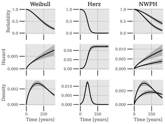Reliability, hazard rate, and probability density function data for the Weibull, NWPH, and Herz models based on the parameters estimated during cross-validation. For the NWPH model, examples from two piping systems are shown. The shaded areas show the mean ± 1 standard deviation.