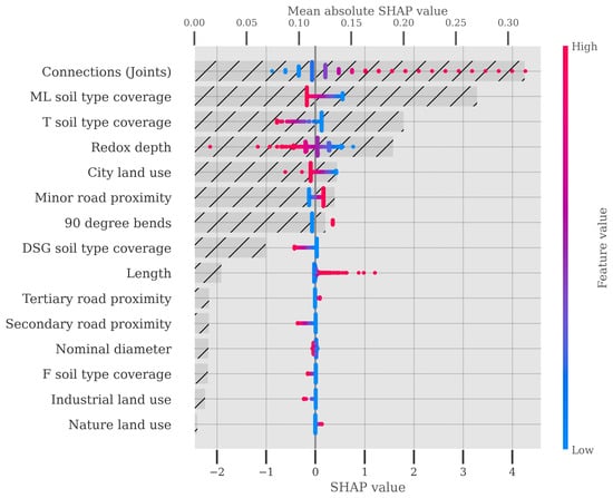 The importance that the neural network of the NWPH model puts on the features of the piping system is shown in Figure 7 using Shapley Additive Explanation (SHAP) values. To produce this plot, the NWPH model was trained on all data. The figure shows both the distribution of the SHAP values for each feature (primary x-axis) and the mean absolute SHAP value or model impact (secondary x-axis). The number of connections each pipe has, each being representative of a joint, is the most important feature, which is consistent with the operators’ experience regarding the failures being typically caused by poor joints. The degree of coverage of different soil types and the redox depth, which is the depth to the anaerobic boundary, also show a relatively high correlation with relative risk according to the NWPH model. The length of the pipe, while positively correlated with the relative risk, has a relatively low impact on the model’s predictions.