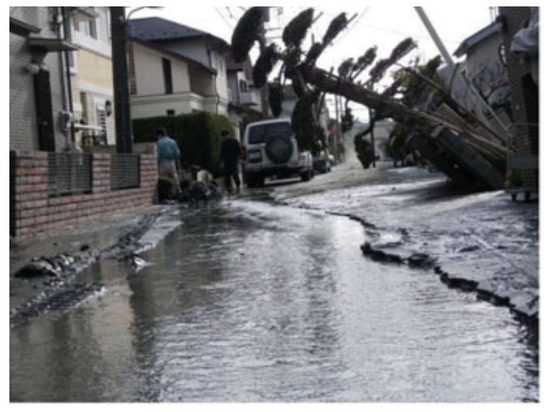 This study focuses on the significant natural hazard of soil liquefaction, as illustrated in Figure 2 and Figure 3 [8,9,10,11,12]. Figure 3, taken from the 2011 Great Japan Earthquake, the largest recorded earthquake in Japan’s history, shows particularly severe liquefaction. This figure shows the ground devastation caused by liquefaction, including toppled trees and the flooding of streets with swirling muddy water in the Urayasu residential area [13]. As a representation of liquefaction damage, Figure 3 highlights the frequent seismic activity in Japan, which often results in severe ground instability. The risk of liquefaction occurs when five specific conditions are met: the fine particle content of the soil is between 15% and 50%; water is present; the soil is loosely compacted; the particle sizes are uniform; and the area has experienced repeated earthquakes. Soil liquefaction primarily occurs due to the shaking of loosely packed, water-saturated soils during earthquakes. This shaking increases pore water pressure and reduces the effective stress between soil particles, leading to fluid-like soil behavior, as depicted in Figure 2. Notable events, such as the 2011 Great East Japan Earthquake and the 2024 Noto Peninsula Earthquake, highlight the devastating impacts of these phenomena and underscore the critical need for accurate prediction and effective mitigation strategies [7].