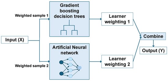 The ensemble machine learning model is established using a boosting algorithm, and the procedure is illustrated in Figure 6, where sample data are randomly extracted from the training dataset. In this study, ensemble machine learning with the boosting algorithm was adopted, and an AI-driven predictive model was created by integrating a neural network with a gradient boosting decision trees model. By combining the strengths of different machine learning models, it is possible to achieve higher prediction accuracy than with a single model.