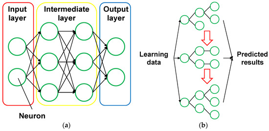 An artificial neural network model as shown in Figure 7a is a soft computing technique used today by engineers around the world for a wide variety of nonlinear problems that can occur in civil engineering [26]. And it is an interconnected collection of simple processing elements, units or nodes, whose functionality is loosely based on the animal neuron. The processing capability of the network is stored in the inter-unit connection strengths or weights, which are obtained through a process of adaptation to, or learning from, a set of training patterns [27,28]. Recently, artificial neural networks achieved outstanding results in learning image representations for various vision tasks, including image classification [29] and object detection [30]. These artificial neural networks typically consist of several components, including convolutional, fully connected, and pooling layers. By stacking several of these layers, convolutional artificial neural networks are able to learn complex features that are highly invariant and discriminative [31]. Previous studies confirmed it as the most suitable and widely accepted statistical approach for soil liquefaction assessment [32,33].