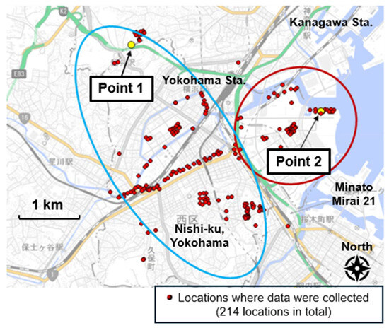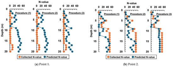 Therefore, Model 2 was selected for prediction. The N-value was predicted using data from 214 sites in Yokohama. Given the differing geologies of reclaimed land and plateaus, Yokohama was categorized into two types: ‘Landfill area (red)’ and ‘Plateau area (blue)’. Areas assumed to be unknown points were distinguished from known points in each category. Point 1 was selected from the landfill area and Point 2 from the plateau area, with their locations illustrated in Figure 8. Additionally, this study predicted the N-value, assumed to be an unknown point, using the following three prediction procedures. The method that achieved the highest accuracy was selected: