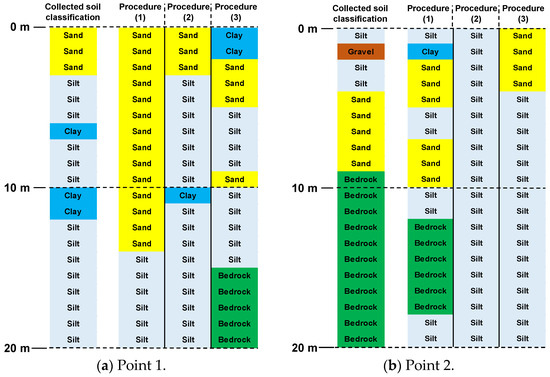 In addition, the three prediction procedures of (1) to (3) used for N-value estimation were also applied to predict soil classification at unknown points. The results are detailed in Figure 11. According to these tables, the results at Point 1 show that the soil type, as identified from geotechnical data gathered from geological columnar sections, is characterized as sand up to about 3 m deep and silt below this depth. Furthermore, the geotechnical data reveal intermittent clay layers from 8 m to 15 m deep, which prediction procedures (1) and (2) failed to detect. In contrast, the prediction procedure (3), which analyzes data from deeper layers upwards, successfully predicted the presence of clay with relative accuracy.