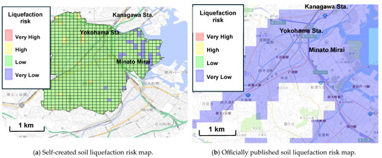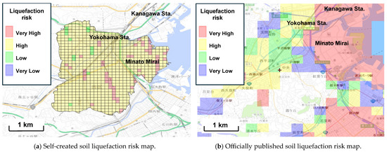 Unlike previous approaches [15,16,17,18], this study first makes predictions for unknown locations and then uses these results to create hazard maps. Soil liquefaction risk maps were developed for three types of earthquake motions. Level 1 earthquake motion refers to seismic activity that is likely to occur once or twice during the lifespan of a structure; however, the intensity of such shaking is relatively low and is not expected to damage the structure. Figure 12a displays a self-created soil liquefaction risk map for Level 1 earthquake motion, while Figure 12b depicts the official soil liquefaction risk map for the same level published by Yokohama. These maps feature a 100 m × 100 m grid and are color-coded according to the soil liquefaction risk. Conversely, Level 2 earthquake motion represents a seismic event that is less likely to occur but could be extremely severe, potentially causing significant damage. This level is subdivided into Type I, which anticipates a major earthquake at the plate boundary, and Type II, which considers an inland earthquake. Figure 13a shows a self-created soil liquefaction risk map for Level 2 earthquake motion with Type I, while Figure 13b shows the official soil liquefaction risk map for the same level and type published by Yokohama. Figure 14a shows a self-created soil liquefaction risk map for Level 2 earthquake motion with Type II, while Figure 14b shows the official soil liquefaction risk map for the same level and type published by Yokohama. The two prediction models differ primarily in their variables. While the existing official map of soil liquefaction risk is based solely on terrain differentiation, our self-generated map incorporates additional variables beyond terrain differentiation.