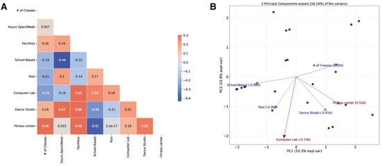 (A) Correlation matrix between center attributes. Each square represents how correlated two attributes are. A score of 1 would mean a perfect positive correlation, and a score of −1 would mean a perfect negative correlation. A score of zero would mean that the attributes are not correlated at all. (B) Biplot of the first two PCA components of center attributes. Each dot represents a community center, projected onto the space defined by the first two principal components. The first principal component (PC1) explains % of the variance, and PC2 explains % of the variance in the data.