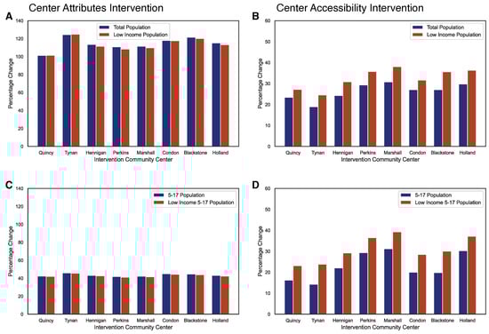 Effect of interventions. (A) Percent changes in attendance for total and low-income total populations when changing center attributes. (B) Percent changes in attendance for total and low-income total populations when changing the walking accessibility to centers. (C) Percent changes in attendance for 5–17-year-old and low-income 5–17-year-old populations when changing center attributes. (D) Percent changes in attendance for 5–17-year-old and low-income 5–17-year-old populations when changing the walking accessibility to centers.