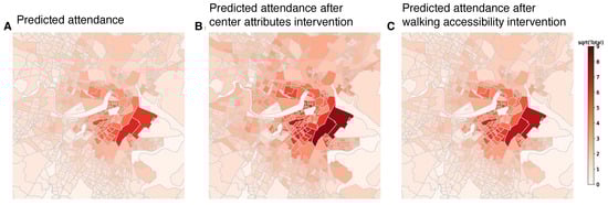 Given the high accuracy of our models, attributed by an RMSE of for the total population model and for the 5–17-year-old population model, we can study the impact on attendance of two interventions: enhancing the center offerings and changing the walking accessibility to centers.