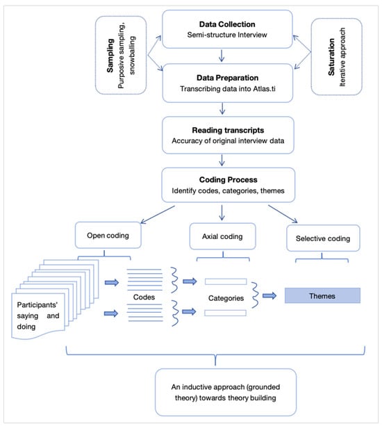 The interviews were digitally recorded and fully transcribed. Our study follows an inductive approach based on grounded theory in qualitative research to analyze the data, focusing on obtaining synergistic knowledge and showing the empirical evaluations []. Data collection and analysis were conducted simultaneously, in line with the iterative approach of qualitative research [,], until no new information appeared to reach the data saturation []. After each interview, we promptly organized and analyzed the data. This research involved several analysis steps. Figure 1 shows the data analysis process of this research. We began by transcribing the interviews in Atlas.ti 22.2.0 qualitative software, and then reviewed all transcriptions twice to ensure the accuracy of the original interview data.