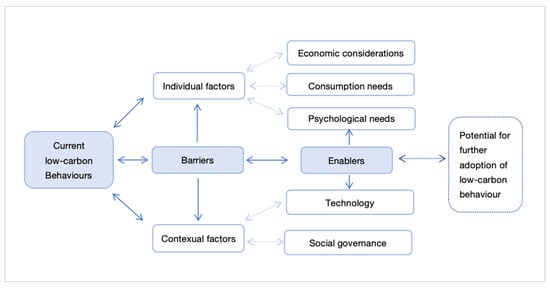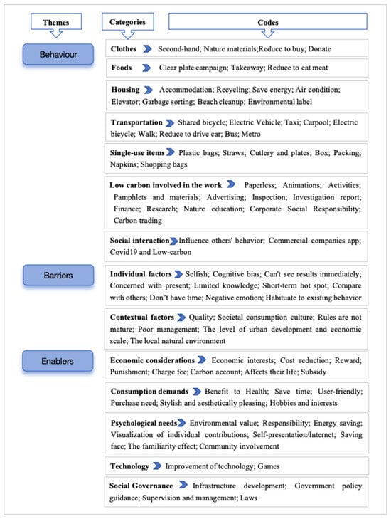 Thirdly, selective coding, the conclusive step in grounded theory analysis, facilitates forming a larger theoretical scheme by integrating categories []. It aims to unveil the interrelations among categories to establish the ultimate thematic frameworks []. We organized the previously established categories into three overarching themes aligned with our research questions: millennials’ low-carbon behavior, the barriers to a low-carbon lifestyle, and the possible enablers for millennials to live a low-carbon life.
