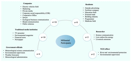 We combined purposive sampling and snowballing methods to recruit participants. Purposive sampling was used to select different cases according to our research questions and aim. In qualitative research, scholars widely use purposive sampling techniques to identify participants who can potentially provide the most effective information based on their related knowledge or experience about the discussion phenomenon [,]. This method requires researchers to select cases with variation in order to collect diverse and rich information [] to achieve a depth of understanding. Therefore, we first created a potential participant list based on our personal networks. Our research targets millennials who were aged 27–42 in 2023 (born between 1981 and 1996) who work in various organizations, including government agencies, academic institutions, media institutions, NGOs, residents, and business companies, with a focus on different fields. Practitioners in these fields are stakeholders in the low-carbon city transformation [], and they are also knowledgeable about millennials’ lifestyles. This age group is 20–35 years away from retirement, and most of them have some work experience. Many people have played or will play managerial roles in their fields, and they will be the key figures over the next 30 years in China’s pursuit of carbon neutrality by 2060. Therefore, millennials’ awareness and behavior regarding low-carbon lifestyles will not only affect the education of the next generation but will also play a significant role in the low-carbon transition and decision-making within their organizations or industries.