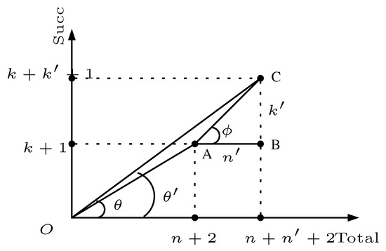 Refer to Figure 2 for a geometric illustration of Lemma 1. Consider a two-dimensional coordinate system where the horizontal and vertical axes capture, respectively, the total number of transactions and the number of transactions in which the seller has fulfilled their contractual obligations. Consider, further, the points of coordinates . It is easy to see that and . Finally, it is easy to confirm that if and only if the angle determined by the sides and of the triangle determined by the points satisfies , exactly as claimed in Lemma 1.