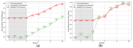 By definition, in the interval , the seller’s reputation score is , , . Similarly, by Theorem 2, their trust measure is