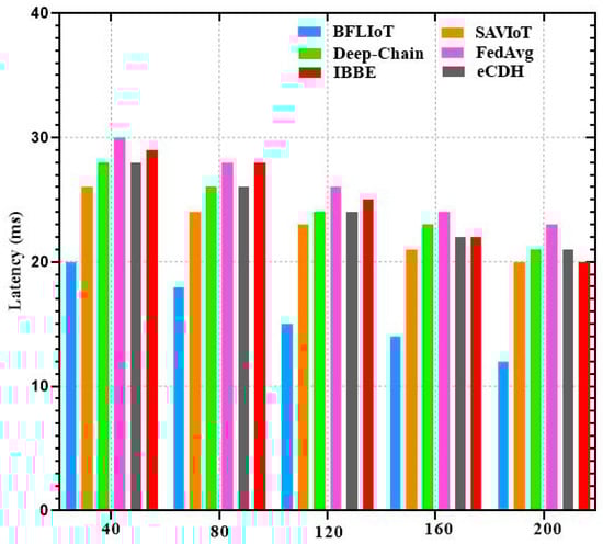 Latency: Latency, in the context of networked systems, typically shows the time necessary for a data packet to travel from its source to its destination. In the framework of a secure and scalable blockchain-integrated framework for FL across the Internet of Things (IoT), latency is a critical metric that can significantly impact the overall performance and responsiveness of the system. The equation for latency can be represented as follows: