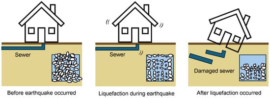 The primary cause of liquefaction is the loss of shear strength due to increased pore water pressure and a reduction in effective soil stress, which ultimately causes sandy soils to exhibit a fluid-like behavior [,,]. As shown in Figure 1, liquefaction is a phenomenon that occurs when an earthquake causes a strong shock to the ground, causing soil particles that were previously in contact and supporting each other to separate, transforming the entire soil into a viscous, liquid-like state. When liquefaction occurs, water can gush out of the ground, causing previously stable soil to suddenly become soft. This can cause buildings to sink or tilt, manholes and buried pipes to rise to the surface, and the entire soil to flow downward. As shown in Table 1, liquefaction is more likely to occur when the following three conditions combine: loose soil, high water table, and an earthquake. Liquefaction has been an important topic in geotechnical engineering since the 1960s, and considerable effort has been devoted to evaluating the liquefaction resistance of in situ soils. The current methodology for this assessment typically relies on in situ measurements, such as the SPT-N value (the number of blows required to penetrate 30 cm in the standard penetration test [,]). Historical records indicate that most severe liquefaction disasters have occurred in geologically young, sandy deposits, such as those found on artificial islands and in former river channels, filled lakes, swamps, and pipeline backfill areas [,,]. The sudden ground instability during such events can cause catastrophic damage to buildings and infrastructure, resulting in significant economic losses and tragic loss of life. This critical issue has been further highlighted in [,,].