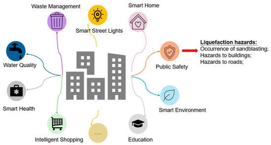 In this study, as shown in Figure 2, an AI-driven predictive model integrates data from various databases, including geotechnical and geographic information, to enhance urban resilience and promote the development of a safer and more sustainable society. This approach contributes to the sustainable growth of smart cities and ensures the safety of their inhabitants [].
