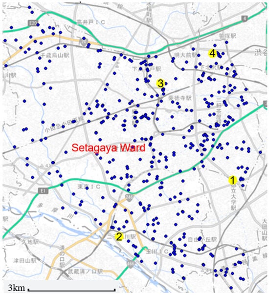 This study used geological survey data from Setagaya-ku, Tokyo. The location information (latitude and longitude) of the survey sites and the depth of the bearing layer were obtained from the results of ground surveys in the Kanto region based on standard penetration tests and mini-ram sounding tests. The specific source of the data on the depth of the bearing layer was the actual experimental investigations conducted in recent years, which were provided by the cooperating company involved in the study. Elevation data were obtained from the Tokyo Geographical Research Institute, which provides a real-time elevation query service. By providing the latitude and longitude of the desired location, the corresponding elevation can be obtained in real time. A specific example of the data is shown in Table 2. A total of 433 data points were used in this study, and the analysis of these 433 data points is shown in Table 3. In addition, the distribution of the 433 data points on the map is shown in Figure 3, with the four locations listed in Table 2 also marked in Figure 3.