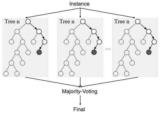 The aggregation of multiple learners results in lower variance for the model, although its bias may remain unchanged, based on the bias-variance decomposition of error for machine learning models. Given multiple models of the same machine learning algorithm trained on different training datasets, the bias represents the similarity between the models’ average prediction and the ground truth, while the variance reflects the variability between the predictions []. Random Forest [], as illustrated in Figure 5, is a well-known implementation of bagging that uses decision trees and introduces additional randomness in the feature selection process during training [].