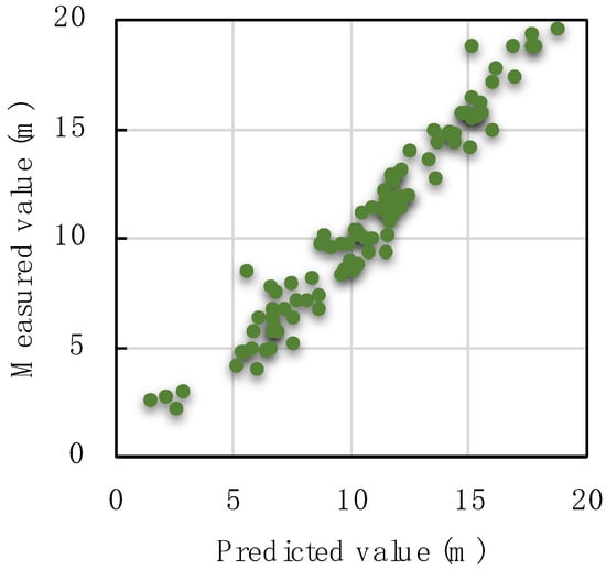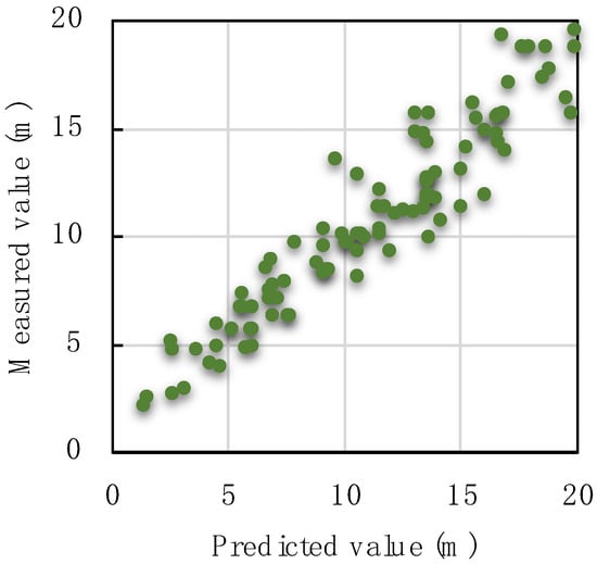 In Case 1, the model created using ANNs was used to predict the bearing layer depth at 10 locations in Setagaya-ku, Tokyo. The actual measurements at these locations were used to evaluate the accuracy of the predictions, and the error values between the predicted and actual measurements were calculated. Table 5 and Figure 7 show the specific prediction results and errors for the 10 points in both cases. Figure 8 shows the prediction results for all points in Case 1, demonstrating the accuracy of the spatial prediction method. Similarly, in Case 2, the same data were used to make predictions using the model created with bagging. Figure 9 shows the prediction results for all points in Case 2.