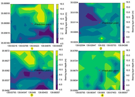 Contour of the bearing layer depth within a 1 km radius at four points (the four numbers are listed in Figure 3).